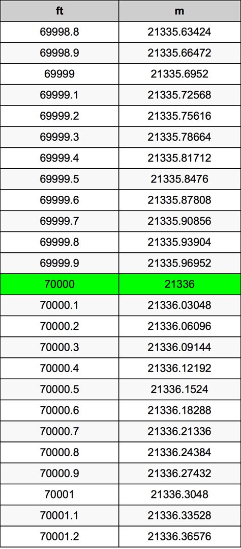 So, 70,000 feet is equal to 21,336 meters. Easy peasy! You can use this same method for converting any number of feet to meters. Just remember that magic number: 0.3048.