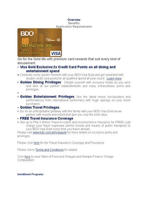 So, what makes a BDO Visa credit card stand out? Besides the dual power of BDO’s local presence and Visa’s global network, there’s a whole host of features and benefits designed to make your life easier and more rewarding. Let’s get into the nitty-gritty, guys. Security is paramount, and with Visa’s technology, you can rest assured that your transactions are protected. Features like EMV chip technology and real-time fraud monitoring are standard, adding layers of security to your spending. Plus, many cards offer contactless payment options, making transactions quick and secure. Rewards programs are a huge draw for many. Depending on the card you choose, you could be earning points that you can redeem for anything from shopping vouchers and gadgets to air miles. Some cards offer cashback, giving you a percentage of your spending back as credit on your statement. Keep an eye out for bonus points or special offers that can significantly boost your earnings. Convenience is another biggie. With widespread acceptance across millions of merchants worldwide, you can use your card almost anywhere. Online shopping, booking flights, paying bills – it’s all a breeze. Many BDO Visa cards also offer installment plans, allowing you to spread the cost of large purchases over several months with manageable interest rates. This can be a lifesaver when you need to make a significant purchase but don’t want to pay the full amount upfront. Exclusive perks and privileges are often bundled with these cards, too. Depending on the card tier, you might get access to discounts at partner merchants, dining deals, travel insurance, airport lounge access, or even concierge services to help with bookings and arrangements. BDO also regularly runs promotions and special offers . These can range from discounts at popular stores and restaurants to bonus rewards on specific spending categories or during certain periods. Staying updated on these can help you save money and earn more. Lastly, responsible use of a BDO Visa credit card can help you build a positive credit history . This is super important for future financial endeavors, like getting a housing loan or a car loan. By making timely payments and managing your credit limit wisely, you demonstrate financial responsibility, which is a win-win in the long run. It’s all about leveraging these features to your advantage and making your money work harder for you.