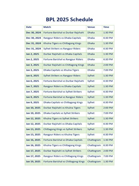Alright, let’s get down to the nitty-gritty: the BPL 2025 schedule. While the exact dates are yet to be officially announced, we can make some educated guesses based on previous seasons and the typical cricketing calendar. The BPL usually takes place during the winter months in Bangladesh, roughly from January to February. Keep an eye on official announcements from the BPL organizers for the confirmed dates. Once the schedule is released, you can expect to see a comprehensive list of matches, including the dates, times, and venues for each game. These details will be available on the official BPL website, as well as on various sports news platforms and social media channels.