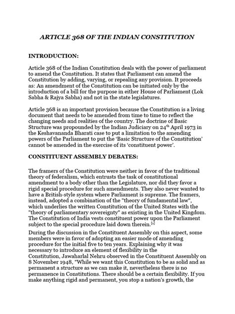 Hey guys! Ever wondered how the Indian Constitution, the supreme law of the land, can be changed? Well, it’s all thanks to Article 368. This article is the key to understanding the amendment process – the legal pathway to modify the Constitution to keep it relevant and responsive to the evolving needs of the nation. Let’s dive in and unravel the intricacies of Article 368, exploring its significance, the procedures involved, and its impact on the Indian legal landscape. We’ll break it down so it’s easy to grasp, even if you’re not a legal eagle!