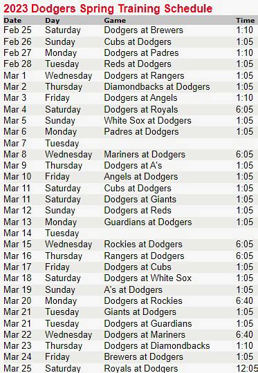 • MLB.com: The official website of Major League Baseball is another excellent resource. It aggregates information from all teams, including the Dodgers Spring Training schedule . It usually includes additional details like TV broadcast information and game summaries. This is great if you can’t make it to the game and need to know where to watch it on TV.