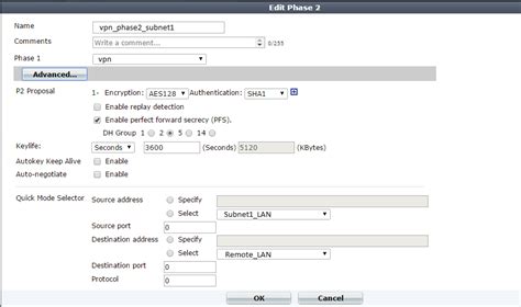 Key Considerations for Phase 2 : Unlike Phase 1, which negotiates the control channel, Phase 2 negotiates the data channel. This means the parameters defined here are what directly secure the traffic flowing between your sites. Mismatched Phase 2 parameters between the two VPN endpoints will cause the tunnel to either not come up at all, or traffic will simply not pass through. This is a very common source of VPN issues. Make sure the encryption, hash, and PFS settings (if used) align perfectly. The local and remote subnets are also critical here. You need to specify which internal networks should be allowed to communicate through this VPN tunnel. For example, your Fortigate might have a subnet 192.168.1.0/24 and the remote subnet is 10.10.1.0/24 . These are defined in the ‘Advanced’ settings for Phase 2. Correctly defining these subnets ensures that only authorized traffic is routed over the VPN, acting as a basic access control list.