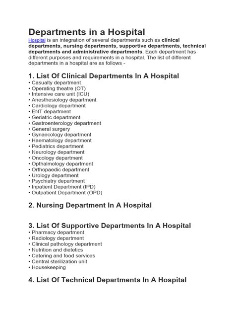 Hey guys! Ever found yourself in a hospital, maybe for a planned procedure or a sudden emergency, and wondered about all those different departments? It can feel like a maze sometimes, right? Well, today, we’re going to break down the essential hospital departments you might encounter. Understanding these can make your hospital experience a whole lot less stressful. We’ll cover what each department does, why they’re important, and what kind of patients they typically serve. So, let’s dive in and demystify the inner workings of a hospital!