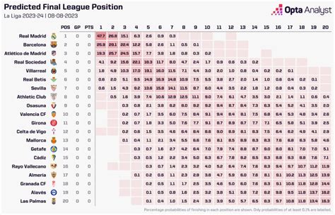 Alright, let’s dive straight into the heart of the matter: the La Liga standings . As of today, the league table is a dynamic reflection of each team’s performance throughout the season. The top teams are locked in a fierce battle for the coveted championship title, while the mid-table teams are striving to secure a spot in European competitions or simply maintain their position. The bottom teams are fighting tooth and nail to avoid relegation, making every match a crucial test of their survival. You’ll find a breakdown of the current standings, including each team’s position, points, wins, losses, goals scored, and goals conceded. This will give you a comprehensive overview of how each team is performing and their chances of achieving their season goals. The teams at the top are usually those with the most consistent performances, the best goal differentials, and the ability to win crucial matches. These teams typically have a combination of experienced players, tactical prowess, and strong team chemistry. Their ability to consistently pick up points makes them the favorites to compete for the championship. The teams in the middle of the table often have a mix of good and bad results. They might have the occasional upset win against a top team or a disappointing loss against a weaker team. These teams are typically fighting for a place in European competitions like the Europa League or the Conference League, which can be crucial for the team’s finances and prestige. The teams at the bottom of the table are in a constant struggle to avoid relegation. Every point is valuable for these teams, as they fight to stay in the top flight and avoid the financial and prestige hits of dropping to a lower division. They often rely on strong defensive play and tactical resilience to try and earn valuable points.