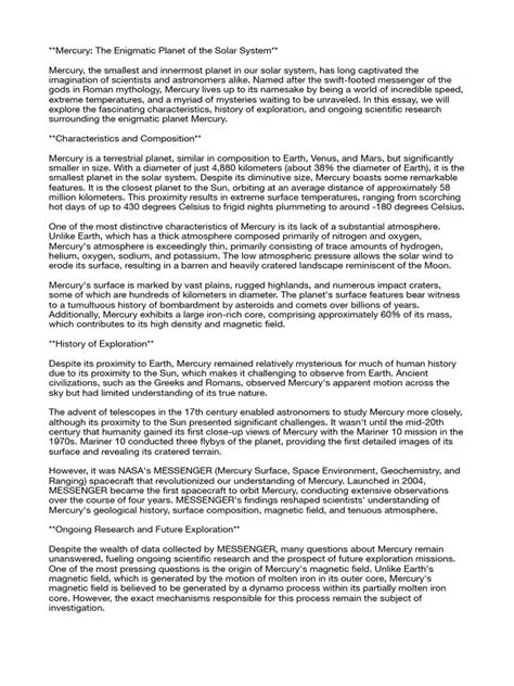 Alright, time to talk about exploring Mercury ! Because of its proximity to the Sun, Mercury is a challenging place to send spacecraft. The heat and radiation are brutal, but that hasn’t stopped us from sending some amazing probes to study this little planet. The first spacecraft to visit Mercury was Mariner 10, which flew by the planet three times in the mid-1970s. Mariner 10 provided scientists with the first close-up images of Mercury , revealing its cratered surface and thin atmosphere. It also discovered that Mercury has a magnetic field, which was a big surprise at the time! Then, in the 2010s, NASA’s MESSENGER spacecraft became the first to orbit Mercury . MESSENGER spent several years studying the planet in detail, mapping its surface, analyzing its composition, and gathering data on its magnetic field and exosphere. MESSENGER made a host of important discoveries, including the presence of water ice in permanently shadowed craters at Mercury’s poles. This was super exciting because it suggested that Mercury might have a more complex geological history than previously thought. The European Space Agency (ESA) and the Japan Aerospace Exploration Agency (JAXA) are collaborating on the BepiColombo mission, which launched in 2018 and is expected to arrive at Mercury in 2025. BepiColombo is an ambitious mission designed to study Mercury in greater detail than ever before. It will investigate the planet’s magnetic field, atmosphere, and surface composition, and also study its interaction with the Sun. The mission carries two orbiters, each with a specific set of instruments, which will work together to create a comprehensive picture of Mercury . Future missions to Mercury will likely focus on even more detailed studies of its surface and subsurface, searching for evidence of past volcanic activity, and further exploring the planet’s polar ice deposits. Scientists are also interested in sending landers or rovers to the surface of Mercury , but this poses huge technological challenges due to the extreme heat and radiation. But the exploration doesn’t stop, and it’s exciting to think about what we might learn about Mercury in the years to come!