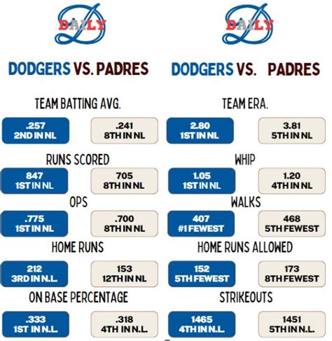 ), the Padres had a slightly higher batting average (.260 vs. .240) and committed fewer errors. The Dodgers had a better ERA because their starting pitcher was dominant for the first five innings. This gives the Padres a slight edge. The