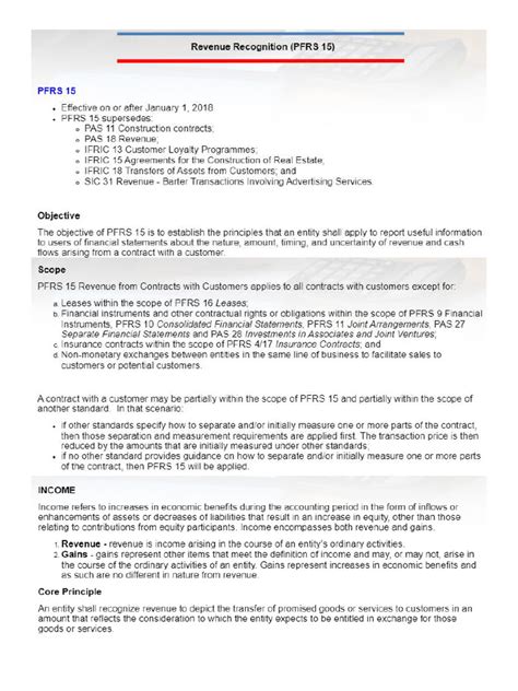 Hey guys! Let’s dive deep into PFRS 15 Revenue Recognition , a super important standard that pretty much every business needs to get a handle on. BDO has put together some awesome insights on this, and we’re going to break it down for you. Understanding revenue recognition is key to knowing how and when a company actually records the money it earns from its customers. It might sound simple, but trust me, it can get pretty complex, especially with all the different types of contracts and transactions out there. PFRS 15, which stands for Philippine Financial Reporting Standards 15, provides a unified approach to revenue recognition, meaning it applies across various industries and types of revenue. Before PFRS 15, different standards and interpretations led to inconsistencies in how companies reported revenue. This made it tough for investors and other stakeholders to compare financial statements accurately. BDO, as a leading accounting firm, plays a crucial role in helping businesses navigate these changes and implement the standard correctly. They offer guidance, training, and services to ensure companies comply with PFRS 15, ultimately leading to more transparent and reliable financial reporting. So, buckle up, because we’re about to explore the nitty-gritty of PFRS 15 and how it impacts your business, all with a little help from BDO’s expertise.