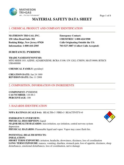 This is your starting point, guys. Section 1 of the MSDS clearly identifies the chemical. For Pyridine, you’ll find its name (Pyridine), synonyms (like Azine), its CAS number (110-86-1 – super important for unambiguous identification!), and recommended uses and restrictions. It also includes the supplier’s information, so you know who to contact if you have questions or need more details. Understanding this section ensures you’re working with the correct substance and know its intended applications, preventing mix-ups that could lead to dangerous situations.