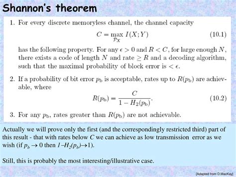Okay, let’s get down to the nitty-gritty. The Shannon Channel Theorem essentially states that for a given communication channel with a certain bandwidth (W) and signal-to-noise ratio (S/N), we can find a maximum rate ©, known as the channel capacity, at which information can be transmitted reliably. This capacity is defined by the famous Shannon-Hartley equation: