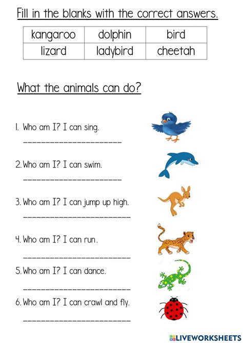 • Animals: Worksheets introduce various animals, both common and exotic, helping children learn their names and characteristics. Activities may include matching animals to their descriptions, labeling pictures, or completing sentences about animals.