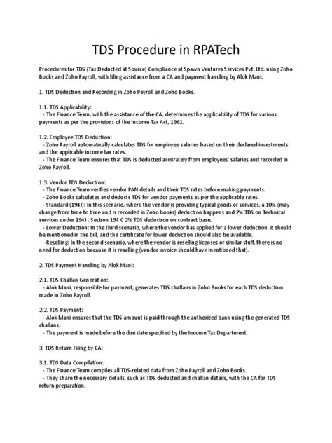 - Determine Applicability: First, figure out if TDS is even applicable. Check if the payment is for professional or technical services and if it exceeds the threshold limit (₹30,000 in a financial year). Also, verify if Zoho has a Permanent Establishment (PE) in India.