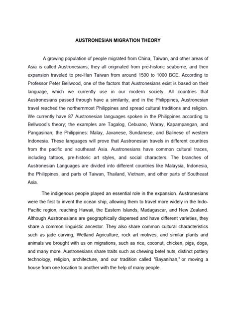 Now, this is where things get really wild, guys! The Austronesian migration theory isn’t just about Southeast Asia; it extends all the way to the remote islands of Polynesia . Places like Hawaii, Tahiti, Samoa, Tonga, and even Easter Island and New Zealand are part of this incredible story. Polynesian cultures, with their distinct languages, social structures, and traditions, are understood as a later development within the broader Austronesian expansion. Imagine these ancient seafarers leaving the shores of Southeast Asia, maybe the Philippines or surrounding areas, and embarking on voyages that took them across thousands of miles of open ocean. They were venturing into the vast, blue unknown, relying on their incredible knowledge of stars, currents, and winds. This wasn’t random drifting; it was intentional exploration and settlement. The Polynesian Triangle, an area stretching from Hawaii in the north, Easter Island in the southeast, and New Zealand in the southwest, encompasses some of the most isolated landmasses on Earth. The fact that these islands were settled by people speaking related languages and sharing common cultural elements is a staggering testament to the capabilities of Austronesian navigators. The languages spoken in Polynesia are clearly part of the Austronesian family, showing the same types of relationships with languages like Tagalog as we discussed earlier, albeit with more divergence due to the long separation. Archeological evidence, such as the characteristic Lapita pottery and the introduction of specific plants and animals, provides a trail leading across the Pacific. The development of unique Polynesian cultures – their sophisticated social hierarchies, their epic myths and legends, their distinctive art forms like tattoo and carving – are all built upon the foundation laid by their Austronesian ancestors. It shows how people adapted to entirely new environments, developing unique ways of life while retaining a connection to their distant past. The journey into Polynesia represents the farthest reach of the Austronesian expansion, a pinnacle of ancient maritime achievement. It highlights the incredible scope of this migration, demonstrating that our ancestral roots stretch far beyond our immediate shores, connecting us to peoples across the Pacific in a shared, ancient heritage. It’s a powerful reminder of our shared humanity and the adventurous spirit that has driven exploration throughout history.