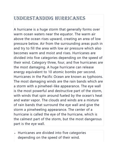Understanding the Anatomy of a Hurricane : A hurricane is structured in a few key parts. At the center is the eye , a relatively calm area with light winds and often clear skies. Surrounding the eye is the eyewall , the most intense part of the storm, with the strongest winds and heaviest rain. Then, there are rain bands , which spiral outward from the eyewall, bringing more rain and wind. Each part plays a critical role in the hurricane’s overall power and impact. So, the next time you hear about a hurricane, remember it’s not just a big blob of wind and rain; it’s a complex and powerful weather system.