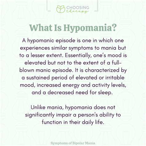 So, first off, what is hypomania ? Think of it as a milder, less severe form of mania, which is often associated with bipolar disorder. When we talk about hypomania, we’re referring to a distinct period where an elevated or irritable mood and increased energy or activity levels are present. This state is characterized by at least three specific symptoms that last for at least four consecutive days. These symptoms are a noticeable change from your usual behavior. It’s not full-blown mania, which can be really disruptive and often leads to significant impairment in functioning, hospitalization, or psychotic features. Hypomania, on the other hand, might not cause severe impairment, but it’s definitely a shift. People experiencing hypomania often report feeling fantastic, full of energy, and incredibly productive. They might feel unusually optimistic, creative, and generally on top of the world. This elevated mood can be infectious, and others might initially see these individuals as charismatic and high-functioning. However, this state isn’t sustainable and can often lead to problems down the line, even if the immediate impact seems positive.