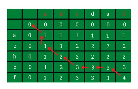 1. The bottom-right cell of the table tells us the length of the LCS (4). Now we need to reconstruct the sequence. We can trace back through the table, starting from the bottom-right cell.